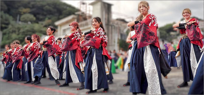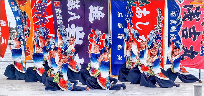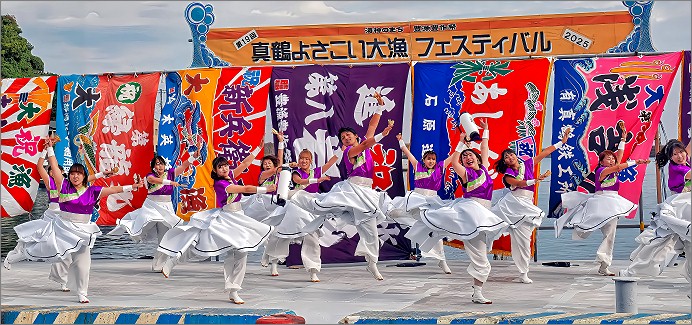 というわけで、キタ君のお気にも召したその真鶴へと行って来た。JRだと小田原から西へ3駅。なにをしにかというと、よさこい見に。正式名称「真鶴よさこい大漁フェスティバル」。漁港にて、大漁旗を背に、岸壁に浮かべた台船の上で行われる。